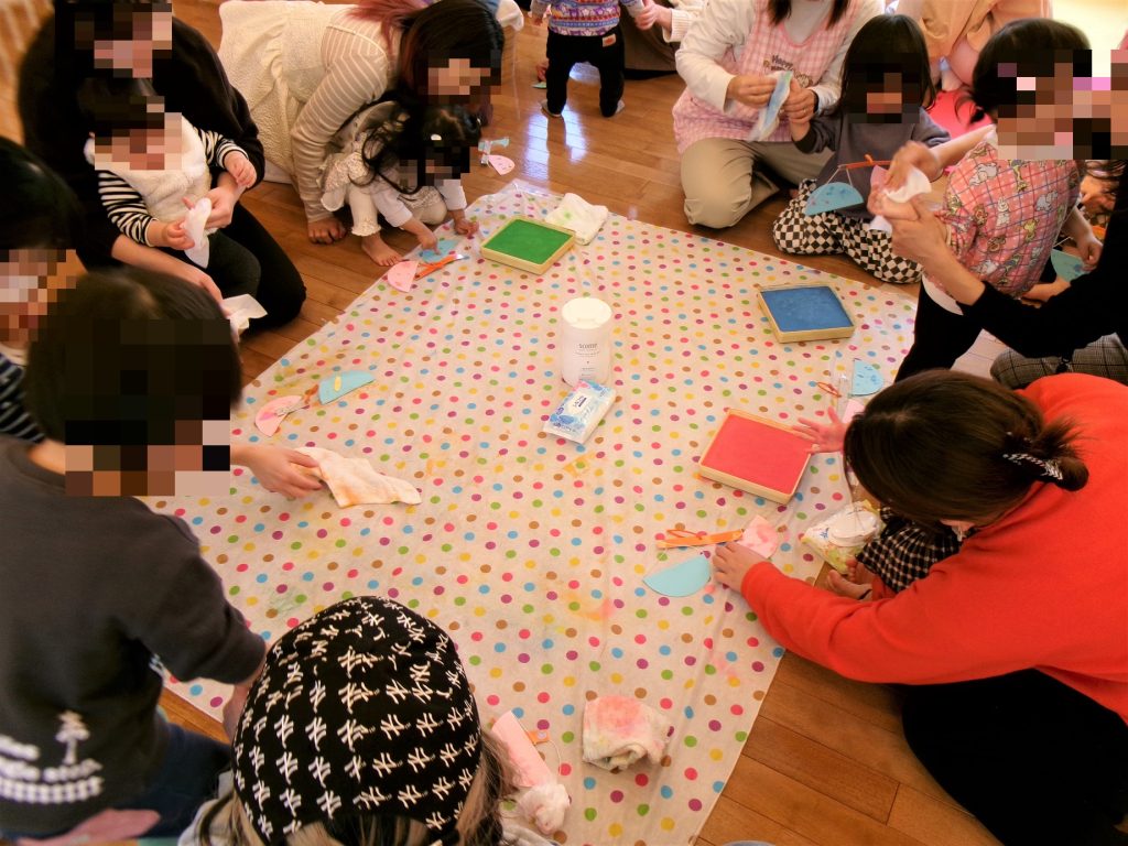 丸い画用紙に、好きな色の指スタンプ。