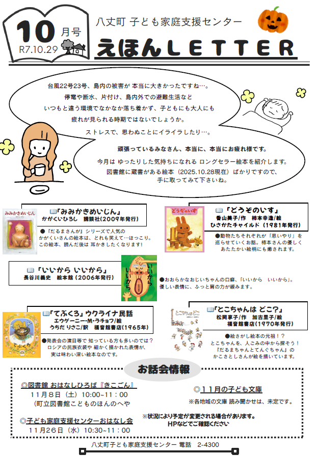 絵本専門士の西條真由美さんによる、10月のおはなし会。